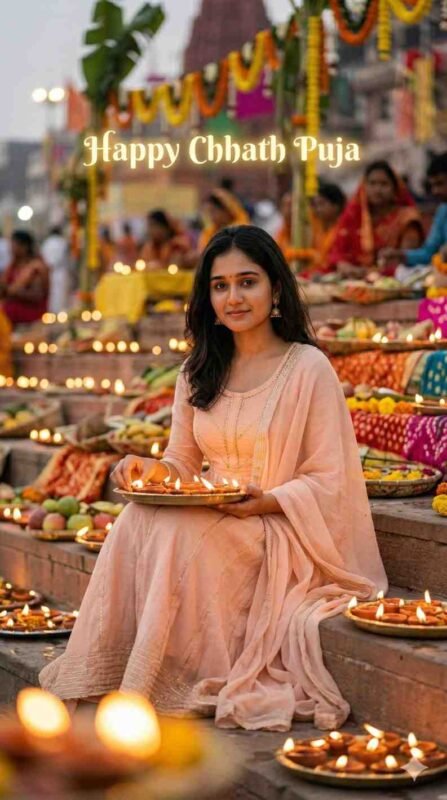 Create an ultra-realistic 8K cinematic portrait of a young Indian woman sitting gracefully on ghat steps during Chhath Puja evening aarti, designed with a soft dreamy Pinterest aesthetic and ultra-HD face clarity. FACE LOCK — ZERO MODIFICATION POLICY Use the uploaded reference image as the exact facial identity reference. Face must remain 100% identical with zero modification. Preserve exact eyes, nose, lips, jawline, skin tone, and natural proportions. FACE CLARITY PRIORITY Face must be crystal-clear, ultra-HD, with natural skin texture and no blur. Face must be the sharpest element. ASPECT RATIO 3:4 vertical STYLE Ultra-realistic DSLR photography, soft cinematic Pinterest style, 8K ultra detail. SCENE A festive ghat filled with rows of soops, diya trays, colorful decorations, and glowing evening lights reflecting on steps. POSE Sitting facing camera Holding a tray full of diyas on lap One hand gently adjusting a diya Straight relaxed posture EXPRESSION Calm emotional expression with soft smile and glowing eyes, showing peaceful devotion. OUTFIT Elegant soft pastel peach Anarkali suit with delicate gold thread detailing and a light flowing dupatta, premium texture. HAIR Smooth open hair with slight shine from lights LIGHTING Warm diya light illuminating face from below Soft ambient evening light Balanced highlights and shadows BACKGROUND Ghat stairs filled with lights Blurred devotees and decorations Strong bokeh effect from diyas TEXT “Happy Chhath Puja” glowing softly above in background. CAMERA & COMPOSITION DSLR 50mm lens Centered portrait framing Ultra sharp face with depth-of-field NEGATIVE PROMPT face blur, motion blur, identity mismatch, plastic skin, CGI look, distorted hands, extra fingers, low detail, overexposed lighting