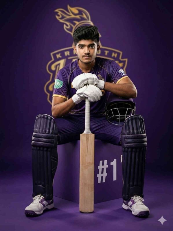Generate an ultra-realistic cinematic DSLR-style photograph inspired by a Kolkata Knight Riders (KKR) cricket-themed environment, ensuring full-body visibility from head to shoes with seamless background and floor color blending. The final image must appear completely natural with zero artificial or edited look. SUBJECT: An 18-year-old attractive young male with a slim and lean physique, featuring narrow shoulders and a defined waist. Facial identity must remain exactly unchanged—no alterations to facial structure, skin texture, pores, beard, or natural features. HAIRSTYLE: Maintain a modern textured side-swept quiff with strong natural volume and deep side flow. Hair should appear slightly messy yet controlled with visible strands, a matte finish, and softly blended sides (no fade). CAMERA & FRAMING: Full-body composition (head to shoes fully visible), vertical format, captured using a 50mm lens. Slight low-angle perspective to create a strong cinematic hero presence. ASPECT RATIO: 3:4 vertical POSE (FORWARD LEAN KING STYLE): The subject is seated on a box, leaning slightly forward with elbows resting on thighs to create a dominant and intense posture. A cricket bat is held vertically between the legs with a firm grip. The helmet is either held near the knee or resting lightly on the thigh. Feet are fully grounded and clearly visible. EXPRESSION: Intense and focused expression with a powerful warrior-like aura. Eyes locked directly toward the camera. OUTFIT (KKR INSPIRED): - Deep purple cricket jersey with gold accents and realistic fabric texture - Matching purple trousers extending to the ankles with natural folds - White batting gloves - Dark cricket pads clearly visible - Cricket shoes (white/purple) fully visible with detailed sole grip PROPS: - Bat touching the ground with visible wood grain texture - Helmet with metallic grill detailing - Complete cricket gear presented with high realism BOX ELEMENT: - Matte purple box used as seating - Clean white “#1” marking - Natural shadow beneath (no glow effect) BACKGROUND & FLOOR: - Deep purple cinematic backdrop inspired by KKR theme - Floor perfectly matches background tone (no visible separation line) - Matte surface with soft realistic shadows - Large KKR-inspired logo centered behind with slight blur LIGHTING: - Soft key light evenly illuminating the subject - Subtle top light for added depth - Rim light outlining subject edges - Balanced cinematic shadowing COLOR GRADING: Rich purple and gold cinematic tones with strong contrast while preserving natural skin tones. DEPTH OF FIELD: Subject remains ultra-sharp from head to shoes, with a softly blurred background. FACE DETAIL: Ultra-HD clarity with razor-sharp focus, maintaining visible skin pores and exact identity accuracy. STYLE: Cinematic cricket poster with ultra-realistic DSLR quality and a dark knight-inspired aesthetic. IMPORTANT RULE: The final output must appear as a real photograph with zero AI artifacts or unnatural elements. NEGATIVE PROMPT: face distortion, blurred face, CGI appearance, cartoon effect, extra limbs, incorrect anatomy, low resolution
