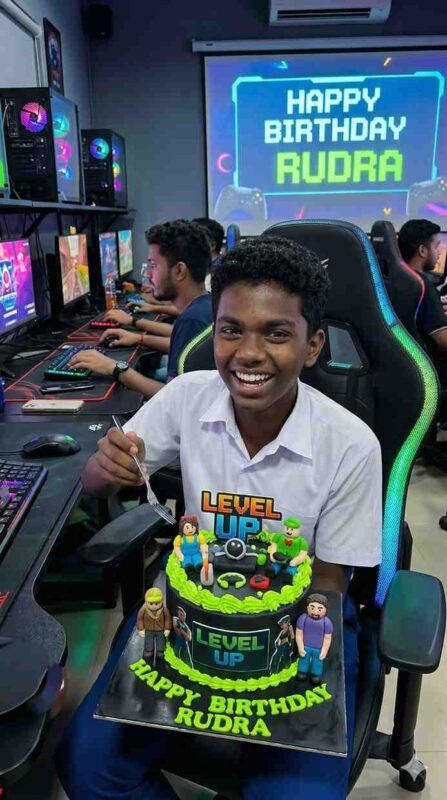 use uploaded person same face same body same eyes same jawline same hairstyle face lock same body overall, a happy boy named Rudra celebrating his birthday inside a vibrant gaming lounge. He is sitting in a professional gaming chair with RGB lighting strips in the background. On the desk in front of him is a customized "Level Up" themed birthday cake with "Rudra" written in bright neon green icing. The wall behind him has a large "HAPPY BIRTHDAY RUDRA" digital banner glowing on a monitor. The lighting is a mix of natural indoor light and the colorful glow from gaming screens. Photo realistic, like a high-quality smartphone click, candid moment, full HD, supreme realism and detailing, natural skin texture, no artificial AI lighting.