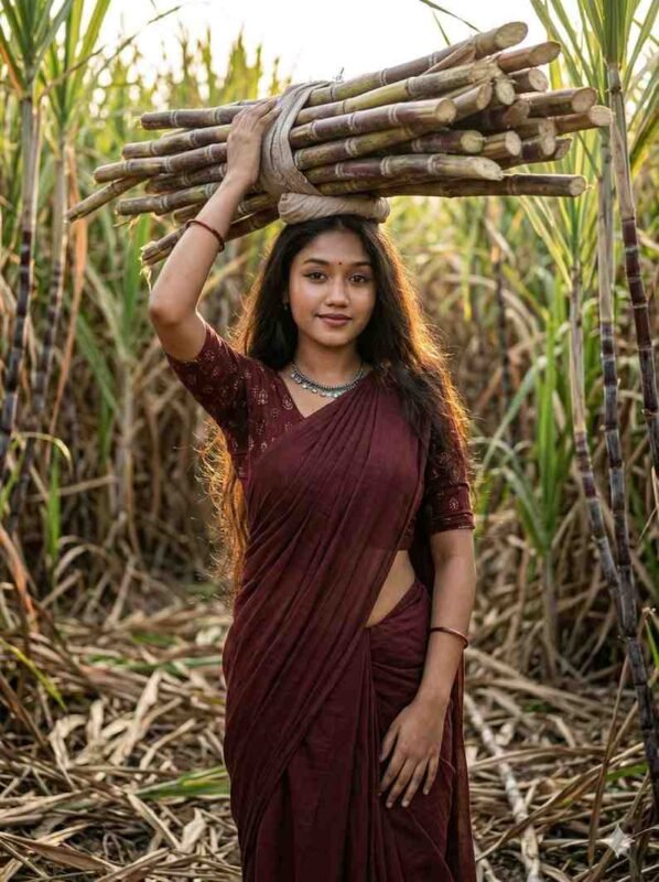 Create a hyper-realistic 8K cinematic portrait of a young rural Indian woman standing in a thick sugarcane field during harvest season. The image should capture strong documentary-style realism with a natural storytelling composition. FACE DETAIL — ULTRA HIGH DEFINITION The face must be extremely sharp and clear with ultra-HD micro details. Skin should display natural texture, visible pores, and realistic highlights. The face should be the sharpest and most focused element in the frame. ASPECT RATIO • 3:4 vertical SCENE A dense sugarcane farm with tall green stalks surrounding the subject. The ground is covered with dry leaves, enhancing the authentic rural agricultural atmosphere. The background should have a soft blur with depth-of-field. POSE The woman is standing upright, slightly angled toward the camera. She is carrying a large bundle of freshly harvested sugarcane on her head, supported by a cloth pad. One hand holds the bundle while the other rests naturally by her side. EXPRESSION A calm and confident expression with a gentle, natural smile. She is making direct eye contact with the camera. OUTFIT She is dressed in a traditional saree in deep earthy tones such as maroon or brown, draped in a rural style. The fabric should show natural folds and realistic texture. The blouse includes subtle patterns with short sleeves. HAIR & SKIN Long dark hair, either loosely tied or flowing naturally with slight movement. Skin tone should appear sun-kissed with realistic highlights and texture. ACCESSORIES Minimal rural jewelry such as simple bangles and small earrings, keeping the look natural and authentic. LIGHTING Warm golden hour lighting coming from the side and slightly behind, creating a soft rim light on the hair and shoulders, with gentle highlights on the face and sugarcane bundle. COLOUR GRADING Use earthy tones like green, brown, and gold with cinematic depth and natural contrast. BACKGROUND Dense sugarcane plants with soft blur and rich texture, enhanced with depth-of-field. STYLE Documentary photography style with cinematic realism, hyper-detailed textures, and natural storytelling. CAMERA SETTINGS 85mm lens, f/1.8 aperture, shallow depth-of-field, HDR, 8K ultra HD quality. CAMERA & COMPOSITION Eye-level framing with the subject slightly off-center. Ensure the face remains ultra-sharp with a natural composition. IMPORTANT RULE The image must look like a real rural photograph. Avoid any artificial or stylized appearance. NEGATIVE PROMPT anime, cartoon, artificial skin, plastic texture, blur, distortion, low resolution