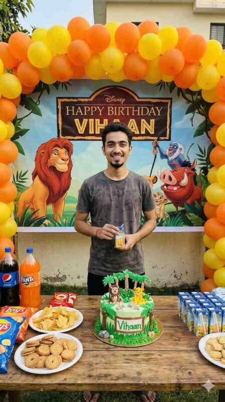 use uploaded person same face same body same eyes same jawline same hairstyle face lock same body overall, a boy named Vihaan celebrating his birthday during a daytime backyard party in India. He is standing behind a rustic wooden table loaded with party snacks. The background wall is covered with a vibrant "Lion King" themed photo backdrop banner featuring Simba and "HAPPY BIRTHDAY VIHAAN". Clustered orange and yellow balloons frame the banner. A beautifully detailed jungle-themed cake sits on the table with "Vihaan" written in green icing. He is wearing a simple casual shirt, smiling warmly as he holds a juice box. Bright natural daylight illuminates the scene. The photo is a candid, high-resolution smartphone click, full HD, extreme realism, detailed texture on the backdrop and cake, natural skin tones.